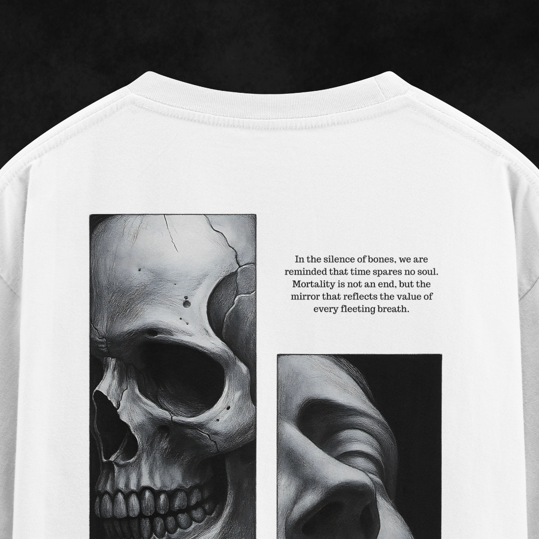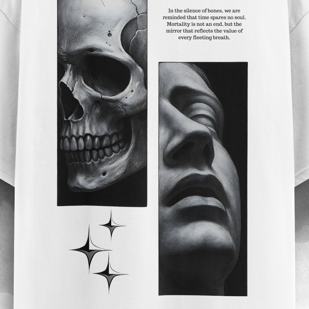 A poetic fusion of art and emotion , this oversized t-shirt embodies the contrast between life and stillness. Featuring a striking skull and sculpture face design, it captures the beauty of reflection and the passage of time. Crafted for those who see fashion as expression, this piece defines minimalist streetwear with meaning.