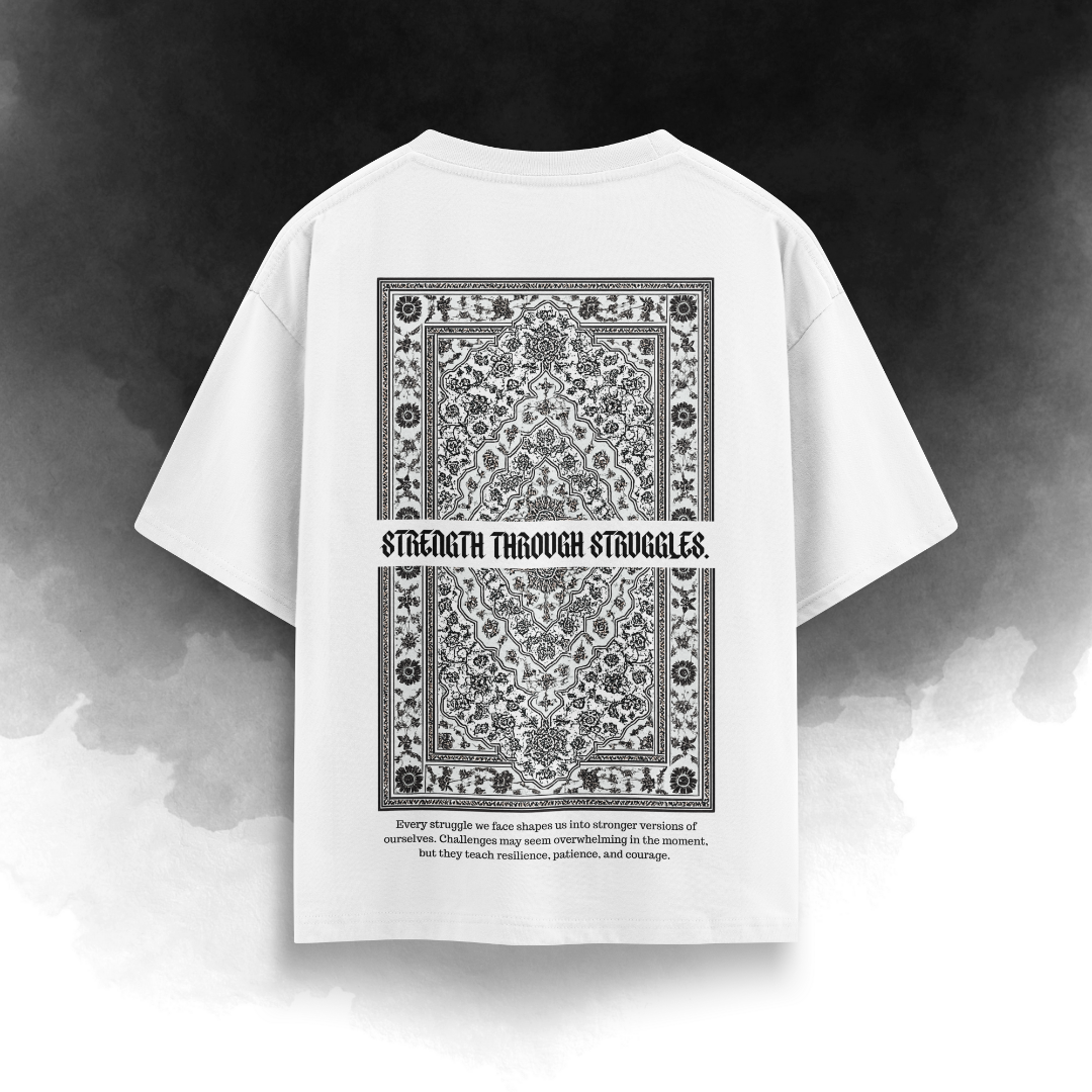 Embrace resilience with the Strength Through Struggles Oversized T-Shirt, a wearable reminder that every challenge shapes strength. Featuring a detailed black vintage pattern and bold typography, this piece symbolizes growth, patience, and courage through adversity.