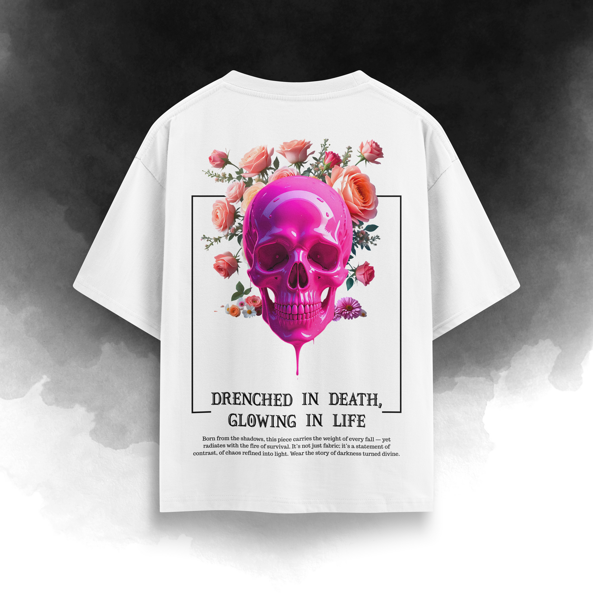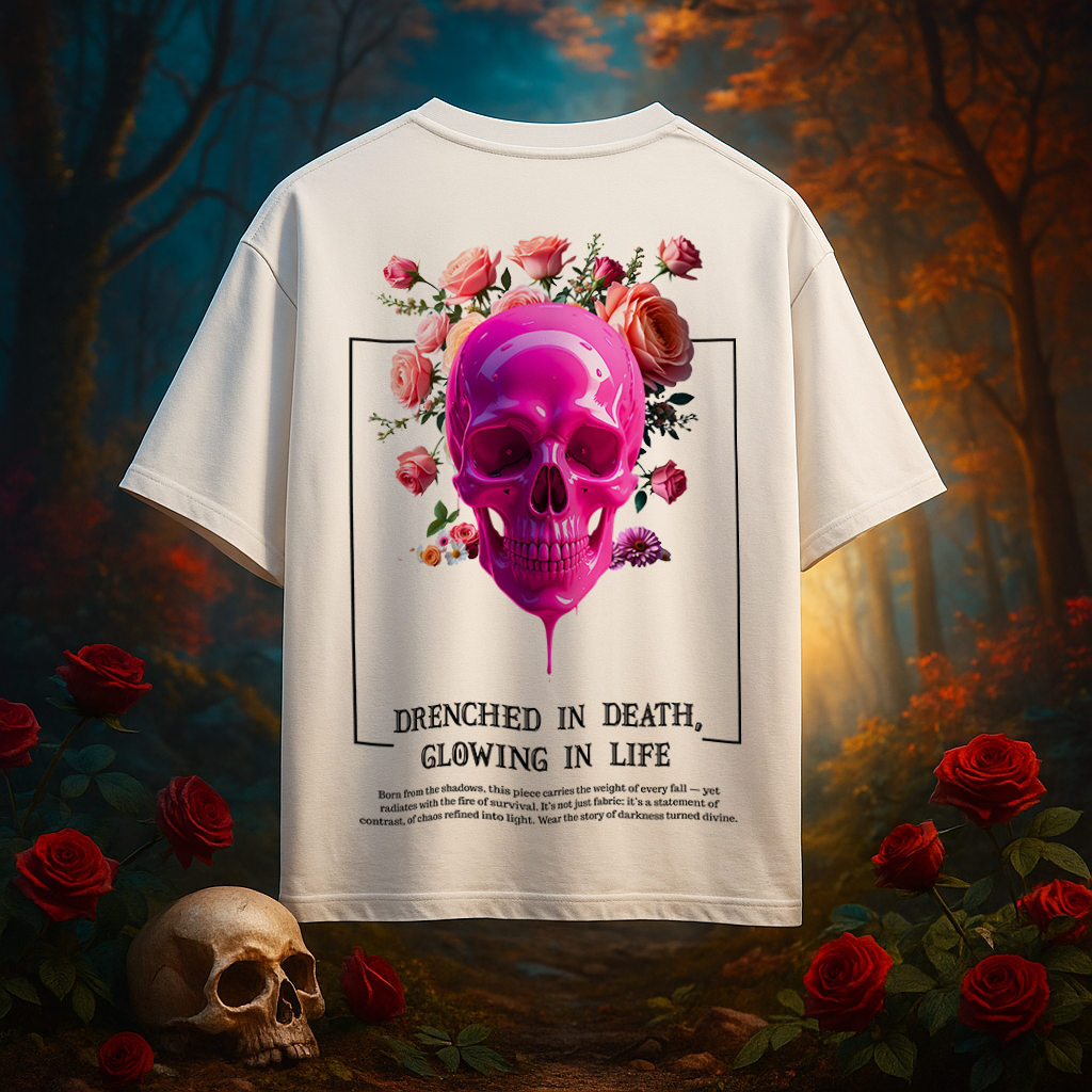 This oversized unisex tee captures a vivid duality: a dripping neon pink skull surrounded by blooming roses, symbolizing the contrast between mortality and beauty, decay and rebirth. Designed for those who wear their darkness like armor and their glow like a crown.
