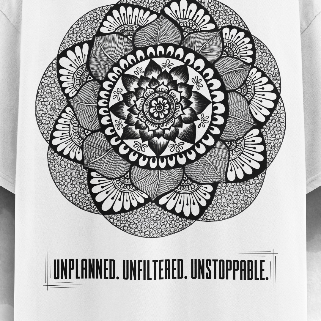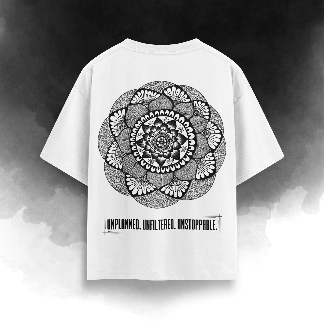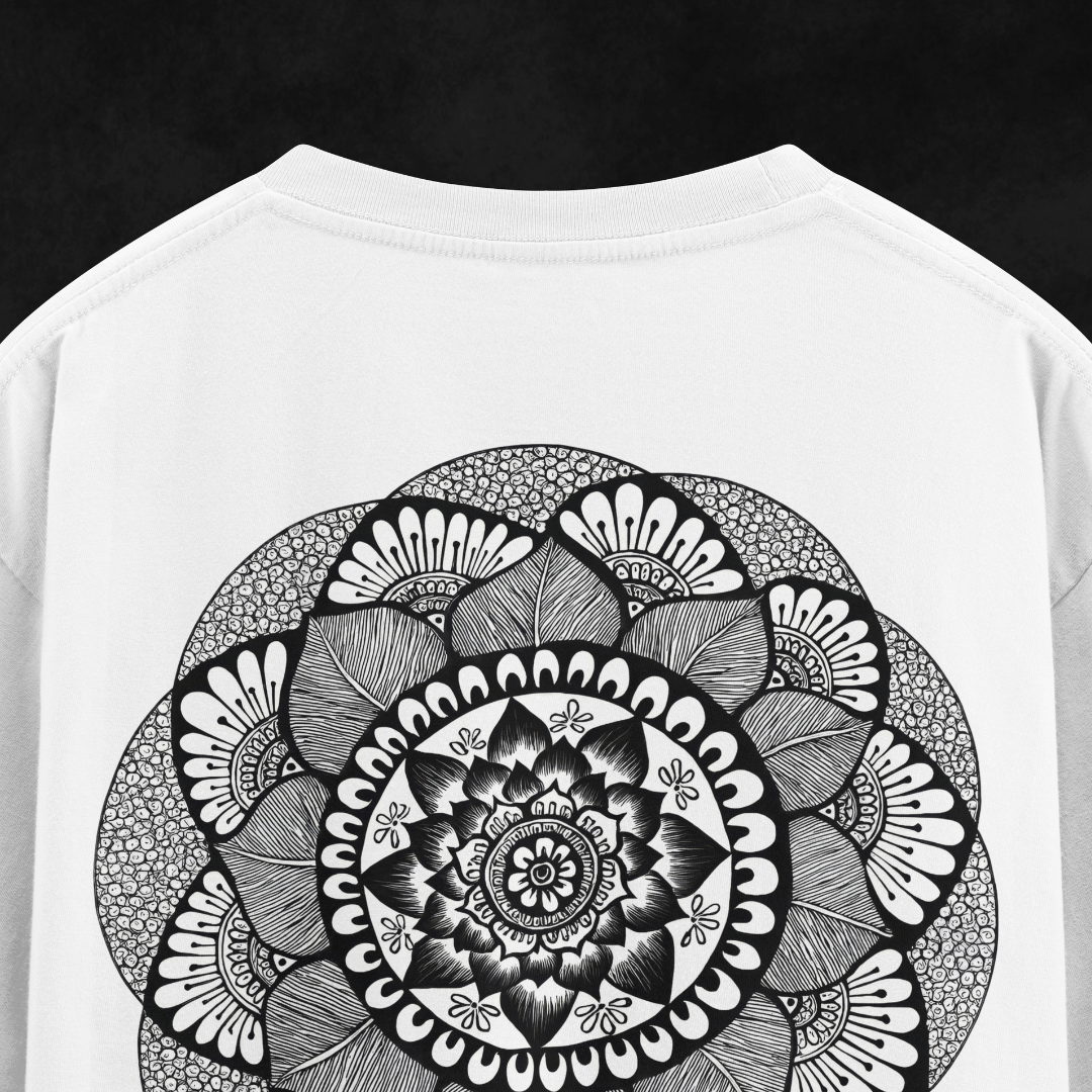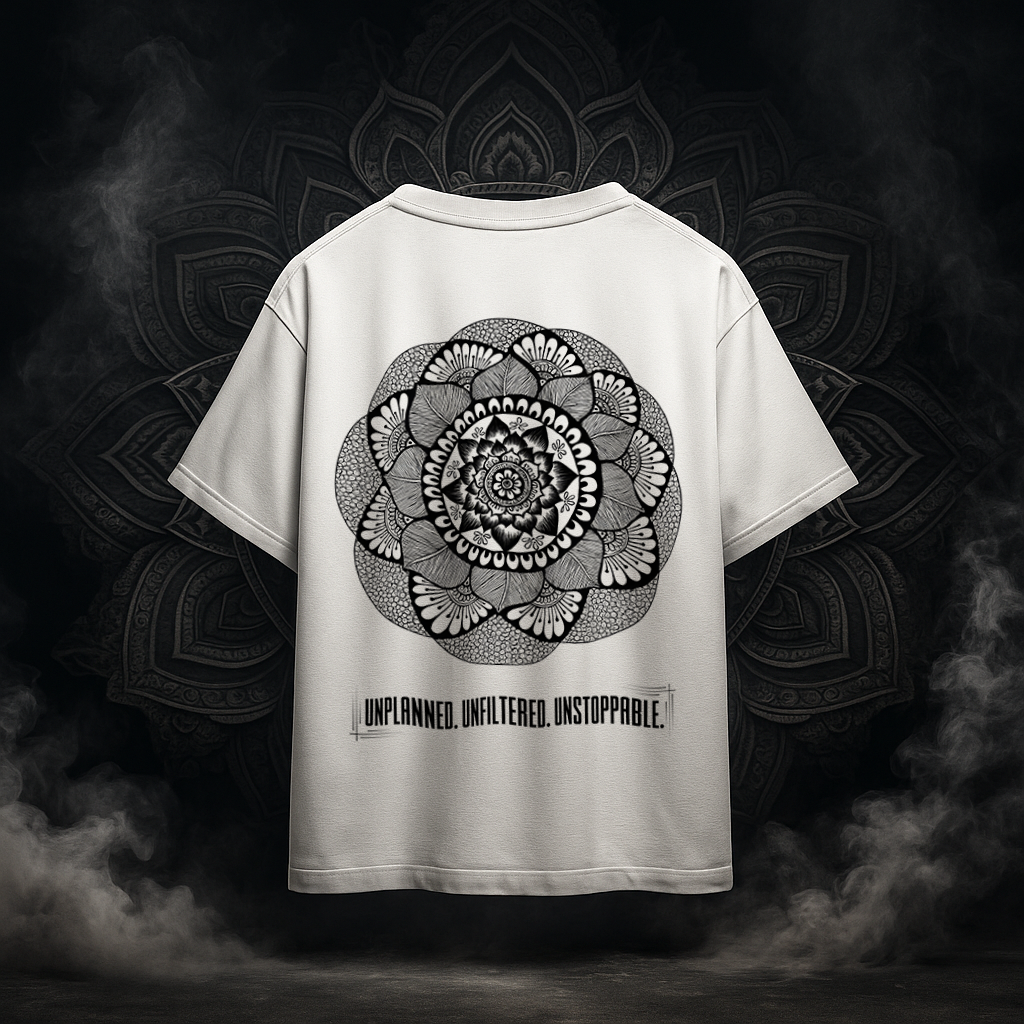 Featuring a hypnotic mandala-style illustration on the back — raw, intricate, and free from structure — this piece embodies energy that flows without limits. The front keeps it minimal with the signature HAZE logo, making it a wearable statement of quiet strength and untamed spirit.