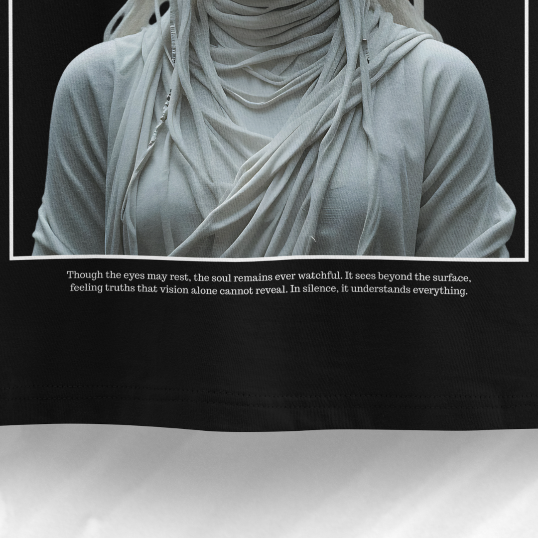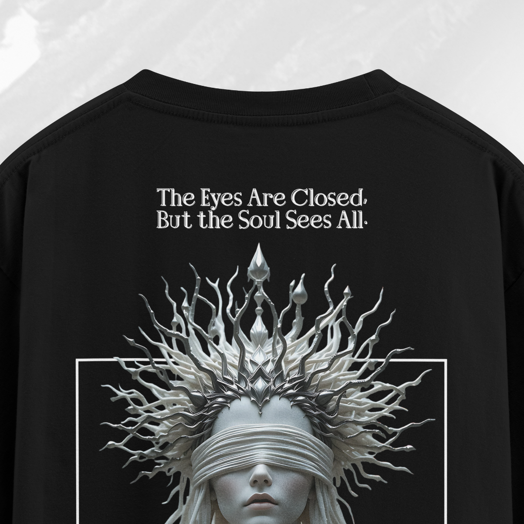 This unisex oversized tee features a hauntingly divine sculpture graphic — blindfolded yet enlightened, crowned in chaos, and wrapped in silence. A visual metaphor for inner sight, intuitive strength, and unseen clarity. The front stays clean with the HAZE logo; the back tells a deeper story in silence and stone.